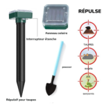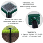 Le répulsif  anti-taupes, fabriqué en ABS et PVC de qualité supérieure, est étanche, durable et respectueux de l’environnement. Il fonctionne grâce à un panneau solaire intégré, offrant une protection efficace sans coûts supplémentaires. Facile à installer, il s’intègre discrètement dans votre jardin tout en étant inoffensif pour les humains et les animaux. Idéal pour pelouses, parcs, fermes et jardins, il offre une solution fiable contre les taupes et les rongeurs.